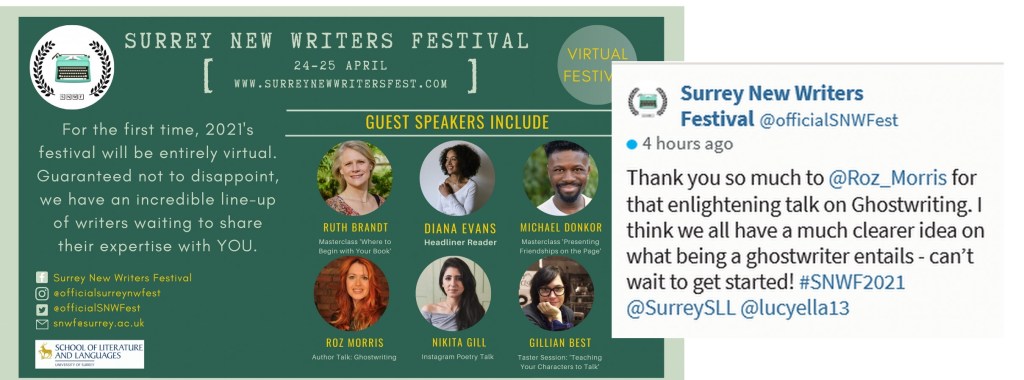 A talk on ghostwriting at Surrey New Writers Festival, April 2021, University of Surrey