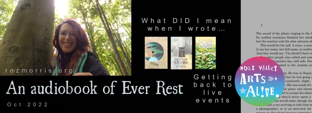 In October 2022 I had two events at the Mole Valley Arts Alive festival in Surrey. One was a book club discussion of my novel, Ever Rest. The other was a talk about the origins of my novel Lifeform Three, which was inspired by the Surrey Hills, and my travel memoir Not Quite Lost, which has come from absolutely everywhere.