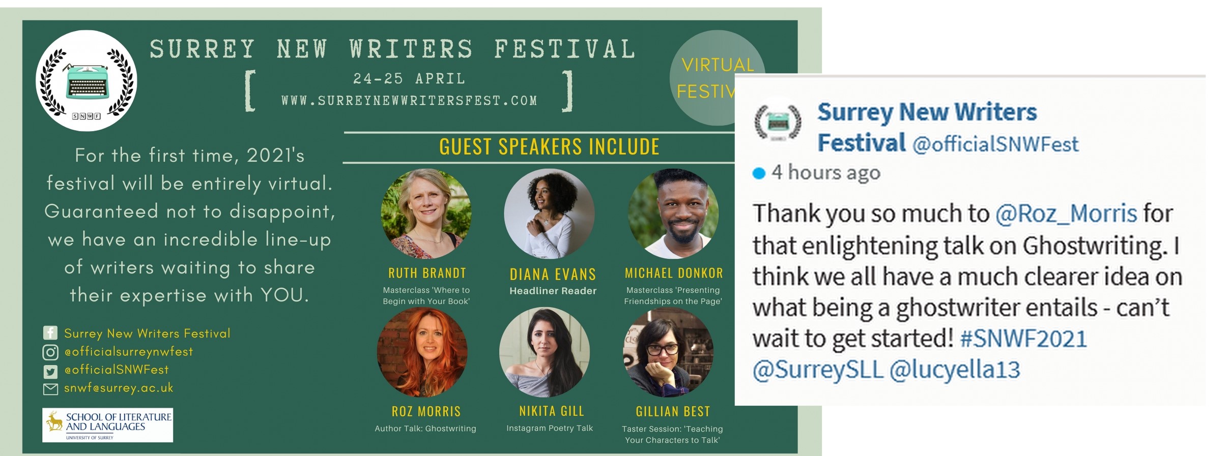 A talk on ghostwriting at Surrey New Writers Festival, April 2021, University of Surrey