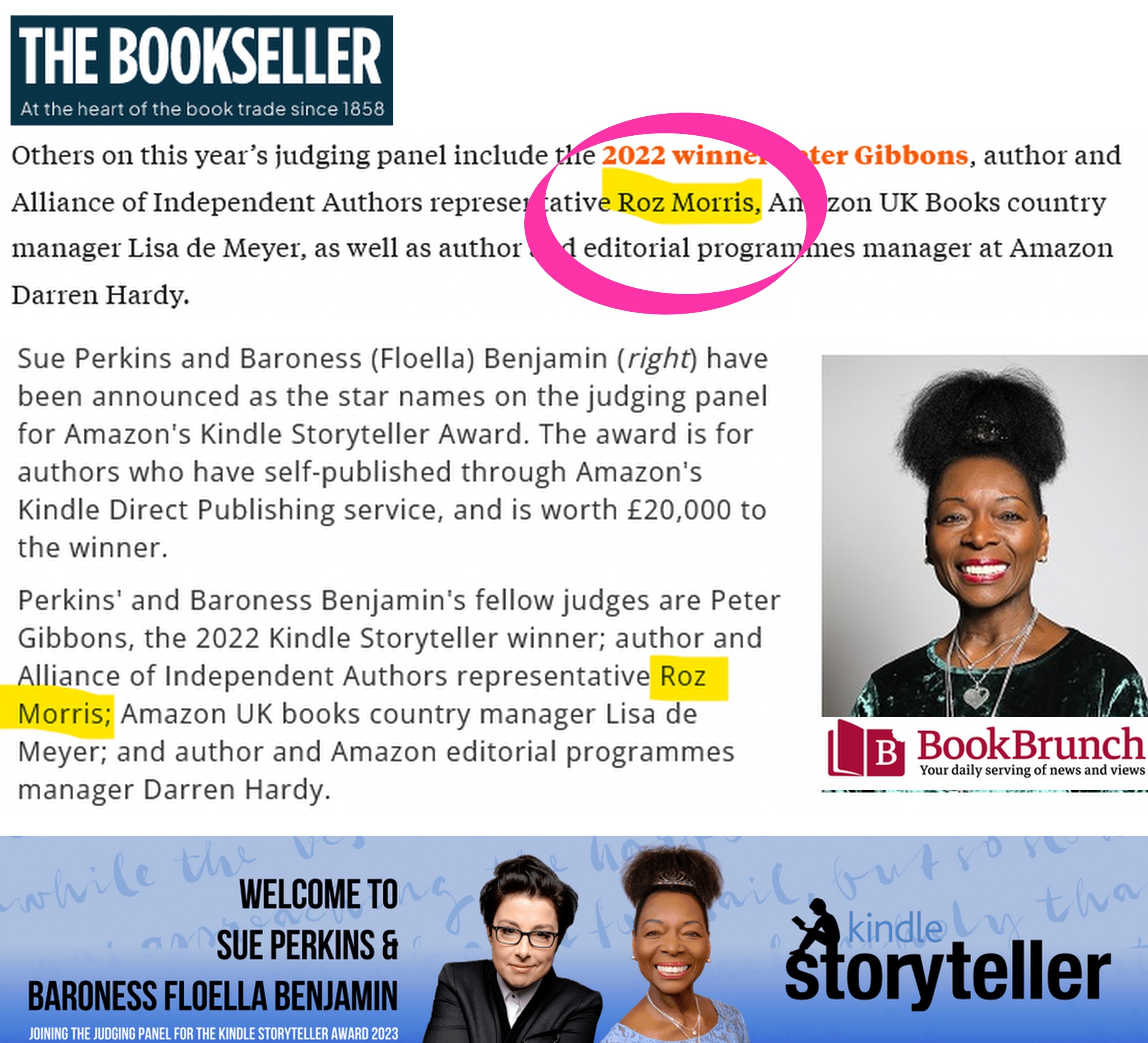 In November 2023 I was one of the judges in the prestigious Amazon Kindle Storyteller Award. My co-judges included comedian, writer and broadcaster Sue Perkins, actress, author, presenter and politician Baroness Floella Benjamin and previous winner Peter Gibbons.